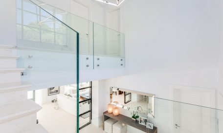 One of the most sought-after attributes there is the presence of large space with natural light, achieved due to the open floor plan iconic in contemporary homes, and abundance of glass, incl. panoramic doors which are much more than just doors but a piece of architecture transforming home. Unique architectural elements (glass balustrades of staircase and inner gallery, double high ceilings, unusual windows and doors), modern electrical fireplace, smart lighting and restricted colour palette add instant contemporary appeal.